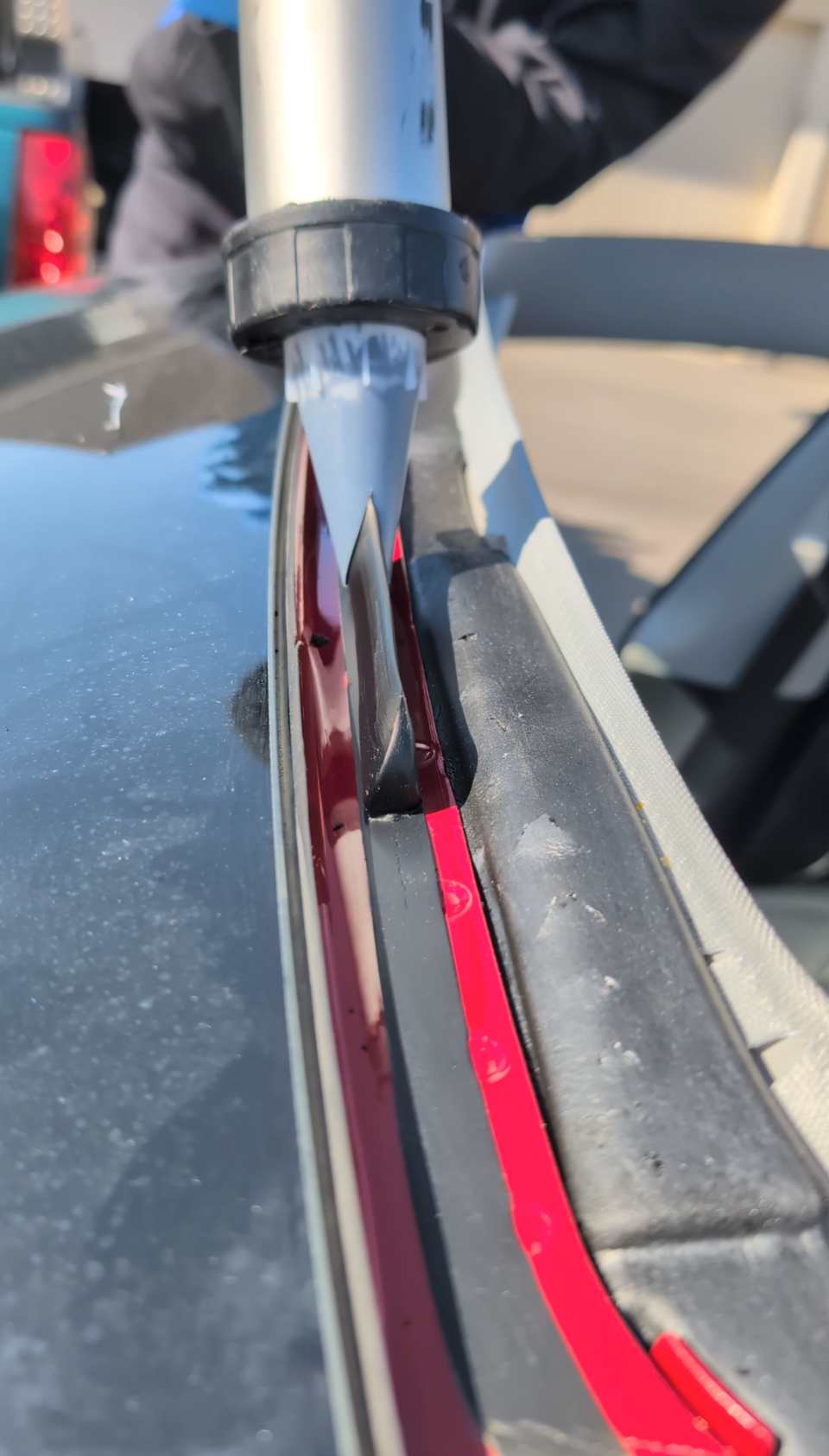 A V-bead of urethane being shot onto the pinch weld of a car.